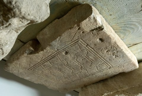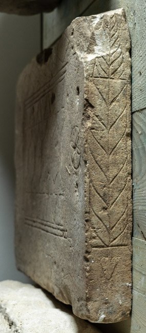 - Linke Seitenwand einer aus Platten zusammengesetzten Aschenkiste. Auf der Außenseite Ritzzeichnung: rechteckiges Bildfeld, darin Reihe von Stäben mit becherförmigen Enden oben und unten. An den Ecken des Rahmens je ein Efeublatt, rechts eine Kreisrosette, oben Rautenfries. An der Stirnseite Zweigornament.