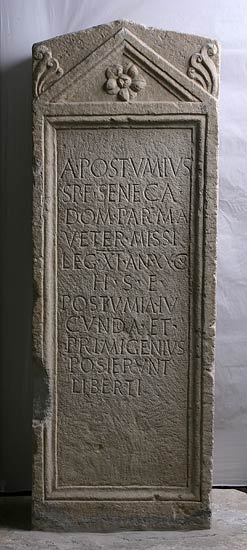 - A(ulus) Postumius / Sp(urii) f(ilius) Seneca / dom(o) Parma / veter(anus) missi(cius) / leg(ionis) XI an(norum) XXCV / h(ic) s(itus) e(st) / Postumia Iu/cunda et / Primigenius / posierunt / liberti