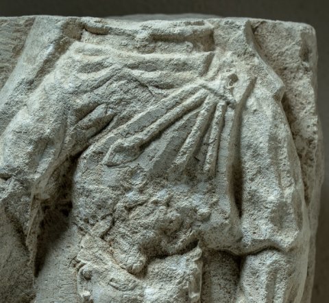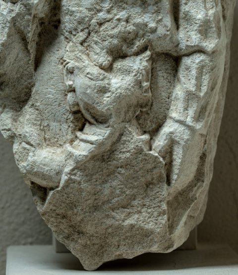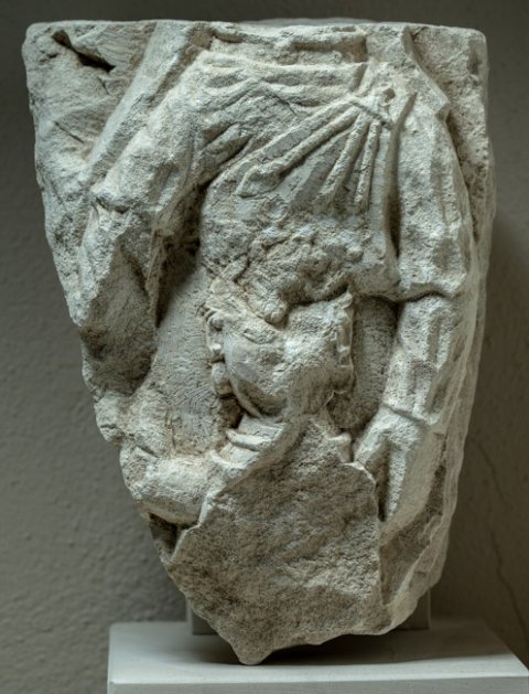 - Oberkörper einer Frau in Ärmelgewand und Schleier, Fibel mit Anhängern, Halsband, vor ihr kleines Kind (Mädchen) mit Halsband und Ohrschmuck (?).