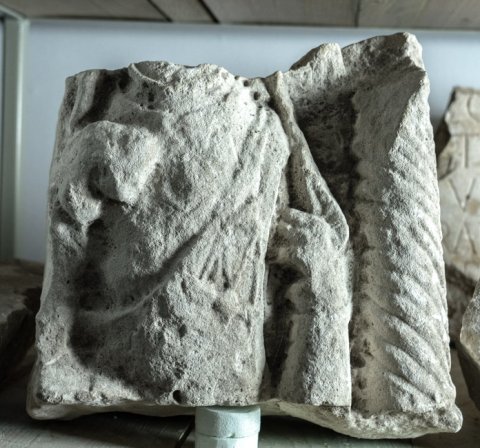 - Halbfigur einer Frau mit Schleier, Halsband und Fibel mit Anhängern. Rechts Säule mit Spiralkanneluren.