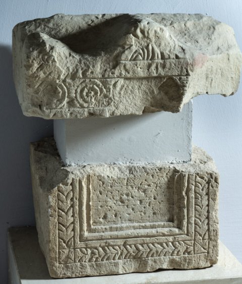 - Kasten mit profiliert gerahmtem, von Leisten mit Zweigornament eingefasstem Schriftfeld (leer, Zeilen geritzt). Deckel mit vier Eckakroteren, auf dem Giebel der Vorderseite Blattdekor, im Fries darunter Reihe von Rosetten.