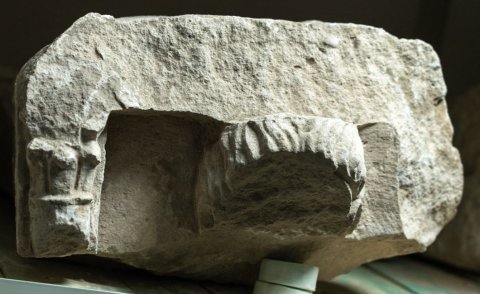- Vom Porträtrelief nur Oberkopf eines Mannes erhalten, links Säule mit Blattkapitell.