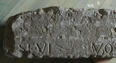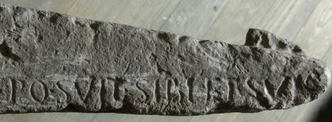 - Dachfrömiger Deckel, im Giebel Kreisrosette (Ritzzeichnung) und einzeilige Inschrift.