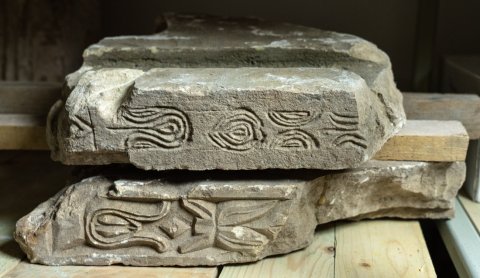 - Seitenwände von zwei aus Platten zusammengesetzten Aschenkisten: a) linke Wand, auf der Innenseite vertikaler Falz, auf der Stirnseite Ornament, Außenseite nicht sichtbar. b) auf der Stirnseite Ornament aus Blattkelchen, andere Seiten nicht sichtbar.