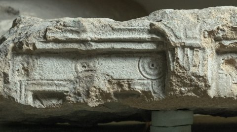 - Vorderwand einer Aschenkiste mit Türrelief, seitlich und in der Mitte kannelierte Säulen, oben Architrav, auf den Türflügeln oben je drei konzentrische Kreise.