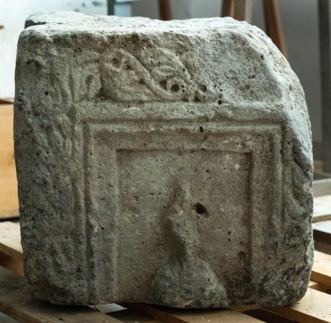 - Eckblock. auf der Vorderseite Oberteil einer männlichen Person (ganzfiguriges Porträt ?), auf der links anschließenden Seite gerahmtes Bildfeld mit Attisfigur, auf den äußeren Rahmenleisten Ranken.