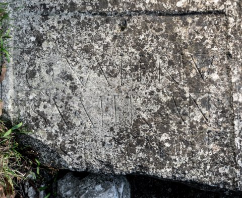 - Oben geritzter Dekor: zwei Felder mit je einem Giebel, darin Rosette, seitlich des oberen Giebel Rosetten. Schriftfeld mit profiliertem Rahmen.