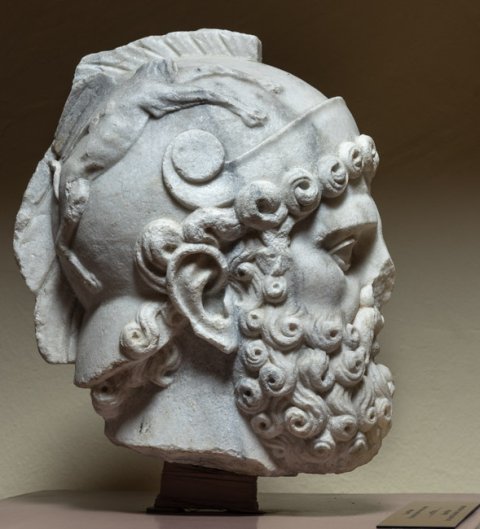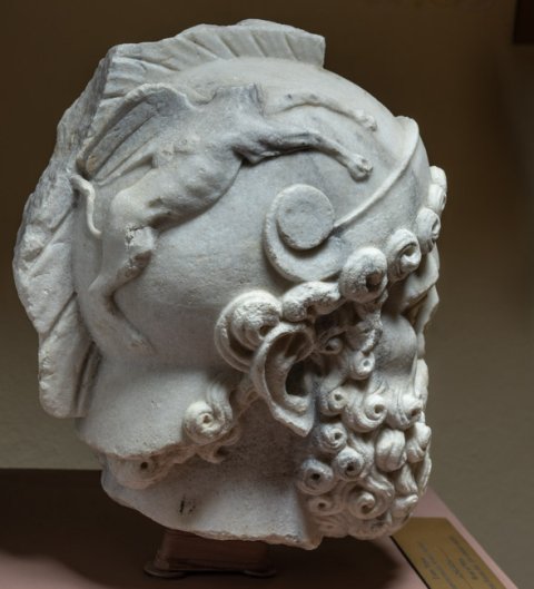 - Mythische Figur: Kopf des Mars mit Helm, darauf Greif im Sprung, Locken um die Stirn und Vollbart archaisierend.