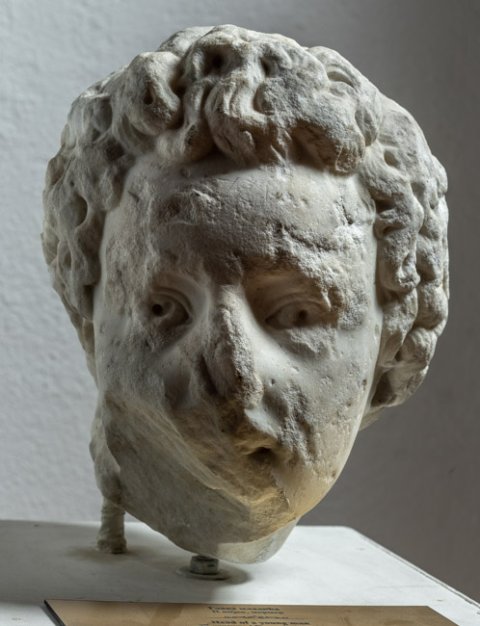 - stark bestoßen, rechts Gesichtsseite abgebr., Bruch unterhalb des Kinns