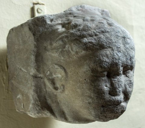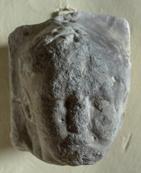 - Kopf einer Frau vor rechteckigem Pfeiler