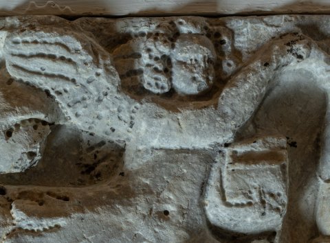 - Erhalten ist der linke von zwei antithetisch an einem Thymiaterion opfernden Eroten, deren Unterleib in Blätter und Ranken übergeht. In der linken Hand Kästchen, in der erhobenen Rechten Fackel ? Unterhalb Kyma.