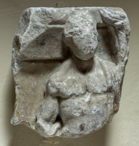 - Mythische Figur ? Erhalten sind Oberkörper und Kopf eines Mannes mit Mantel auf der linken Schulter, rechts neben seinem Kopf Rest einer Fackel, links eckiger Vorsprung. Teil eines Sarkophagreliefs ?
