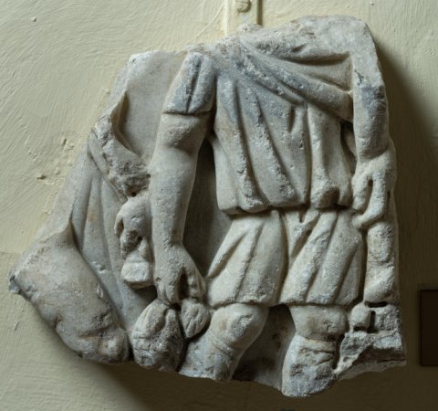 - Rechts stehender Mann in kurzer Tunica, Hosen und Mantel, in der gesenkten Rechten Beutel (Vogel ?), linker Arm um Stamm oder Säule gelegt (?). Links nacktes Bein eines nach rechts ausschreitenden Mannes mit Mantel, auf dem linken Arm Reliefreste eines Attributes. Jahreszeiten ? Sarkophagfragment ?