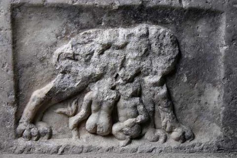 Im Zwischenfries Tiere: Baum, links Pferd, rechts Panther, der Pferd jagt. Schriftfeld zwischen Säulen mit Spiralkanneluren. Im Sockelbild Mythos (Lupa Capitolina). - Inschrift