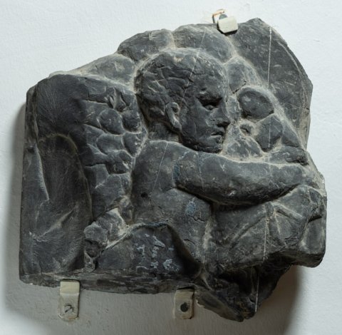 - Nach rechts gewandter Erot, der eine große Girlande hält (Sarkophagfragment ?).