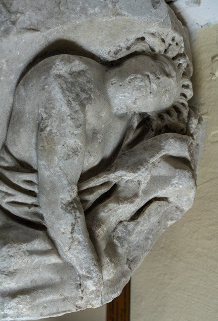 - Mythos ? Auf der Vorderseite schlafender Jüngling (Endymion ?) in halb sitzender Stellung, Mantel um Hüften und Beine. Am oberen Rand des Mantels greift die rechte Hand einer weiteren Person an (Eros aus dem Gefolge der Selene ?). Auf der linken Nebenseite Reliefrest.