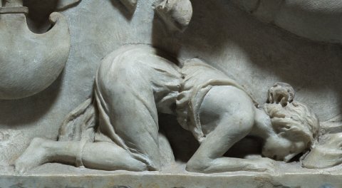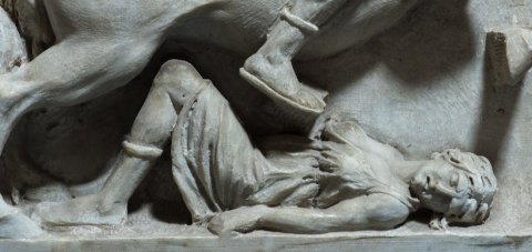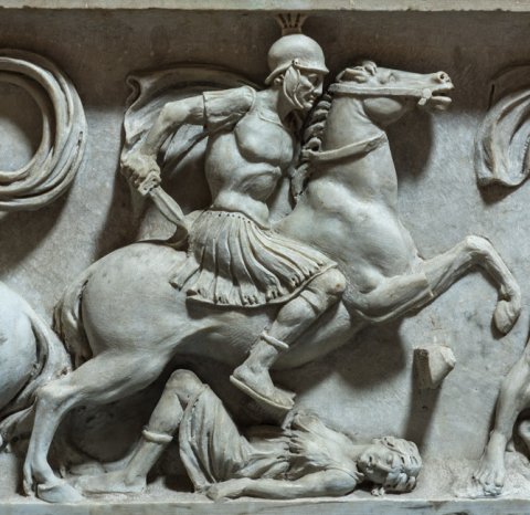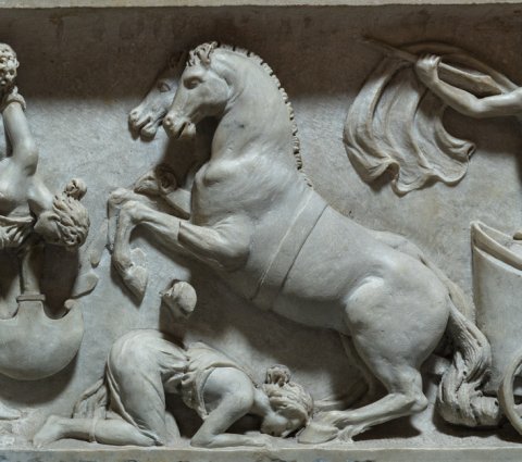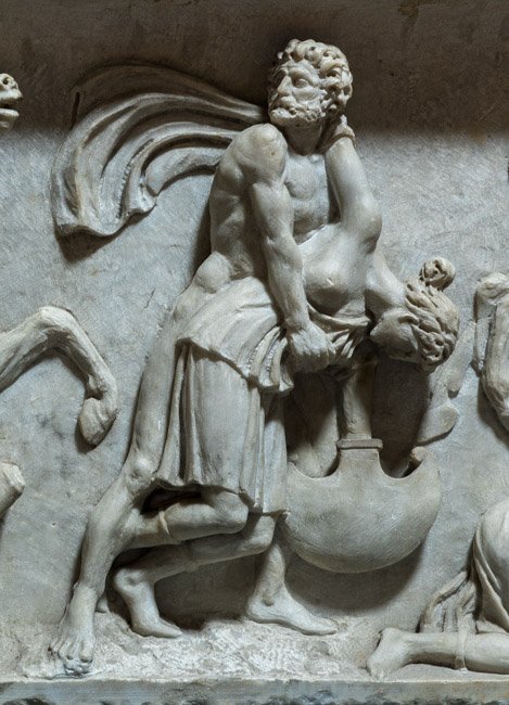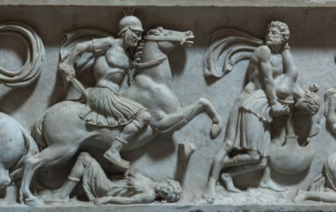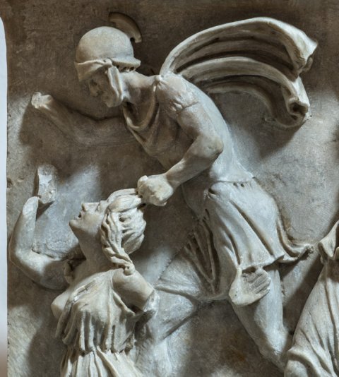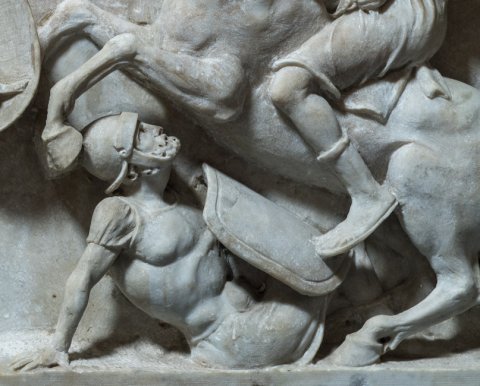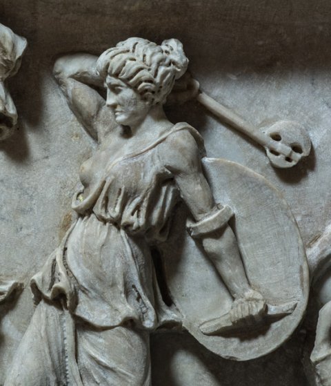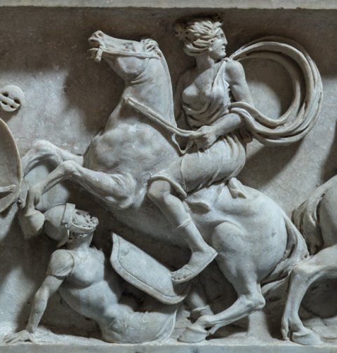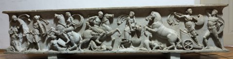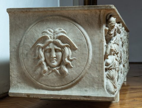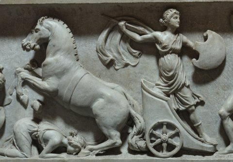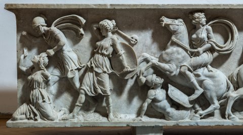 - Mythos: auf der Vordeseite Amazonomachie, auf beiden Schmalseiten Rundschild mit Gorgoneion