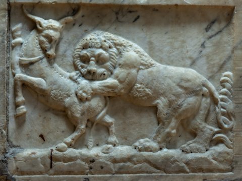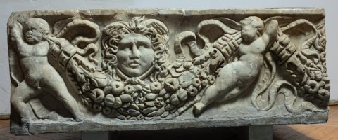 - Vorderseite: Eroten, die Fruchtgirlanden mit Taenien tragen, im Girlandenbogen Gorgoneion. Linke Schmalseite: von Pfeilen getroffene Löwin. Rechte Schmalseite: Löwe packt einen Stier.