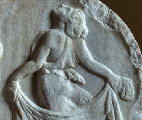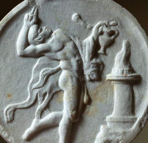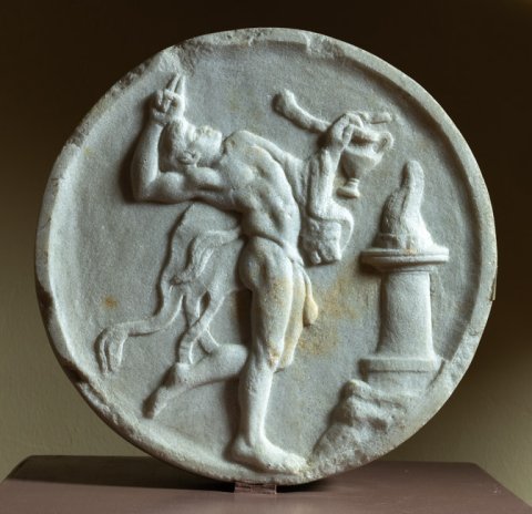 - Beidseitig reliefierte runde Platte. Auf einer Seite tanzende Mänade, vor ihr rundes Postament mit Silensmaske, am Schaft angebundenes Rutenbündel (Syrinx ?). Auf der anderen Seite tanzender jugendlicher Satyr mit Tierfell über dem Arm, in der Linken Kanne und Pedum, vor ihm Rundaltar mit Flamme. Neuzeitliche Kopie ?
