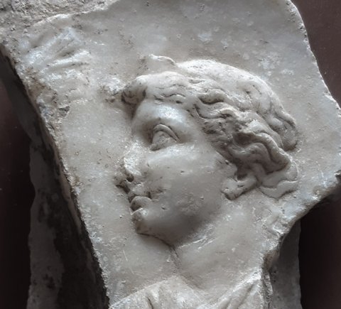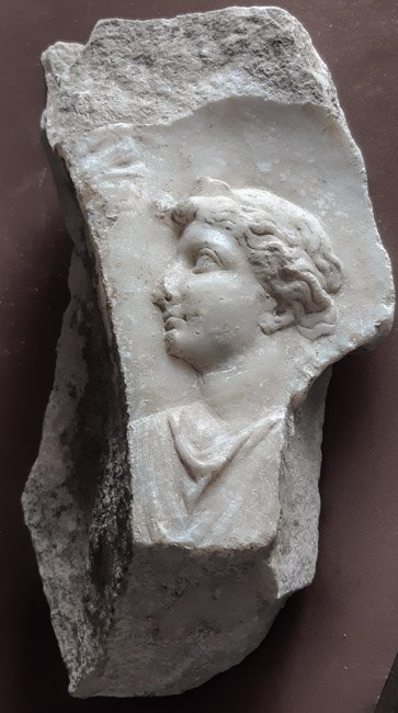 - Kopf und Teil des Oberkörpers einer bekleideten jungen Frau mit Diadem, im Profil nach links. Historische Person ? Livia ?