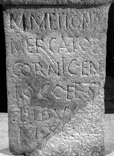 - M(arcus) Melloniu[s] / Mercator / cornicen / loco test(amento) / dibu[s] / M(anibus?) s[acr(ato?)