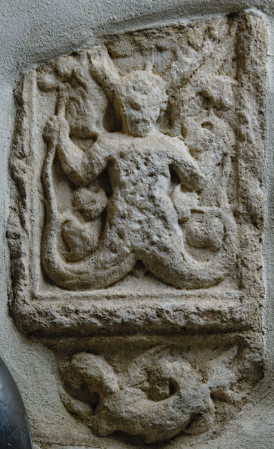 - Sockelfeld mit Meerwesen (Seedrache), im Hauptbildfeld Rankenfrau, darüber Reste von zwei Füllhörnern, oben geschwungener Rahmen, darunter Delphin und Mädchen.
