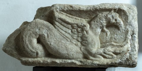 - Rest einer Zwischenfriesplatte mit Meerwesen, auf der Vorderseite Seegreif nach rechts.