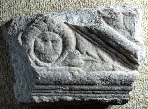 - Teil eines eingeschriebenen, profiliert gerahmten Giebels mit Gorgoneion zwischen Zweigen.