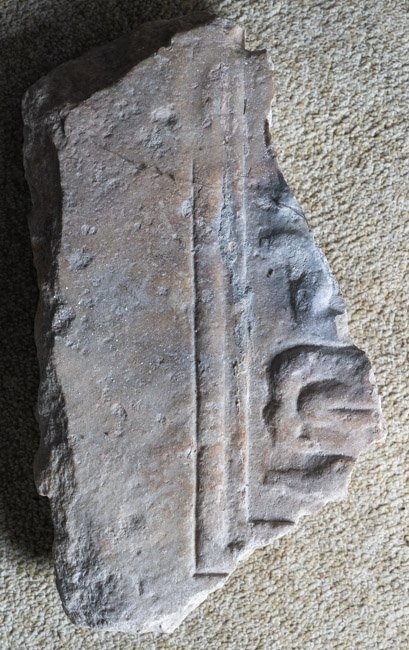 - Teil einer Platte mit gerahmtem eckigem Feld, darin Ornamentreste ?
