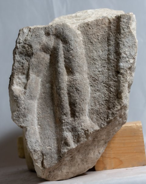 - linker Arm und linke Körperseite eines auf gesenkte Fackel gestützten Trauergenius