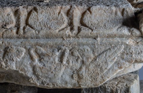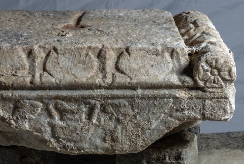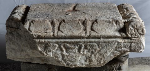 - Geschnürte pulvini mit Blattdekor, vorn Rosetten. Auf der Vorderseite Blattfries, darunter Krater zwischen geflügelten Seepanthern. Auf den Nebenseiten Meerwesen (Seegreife ?).