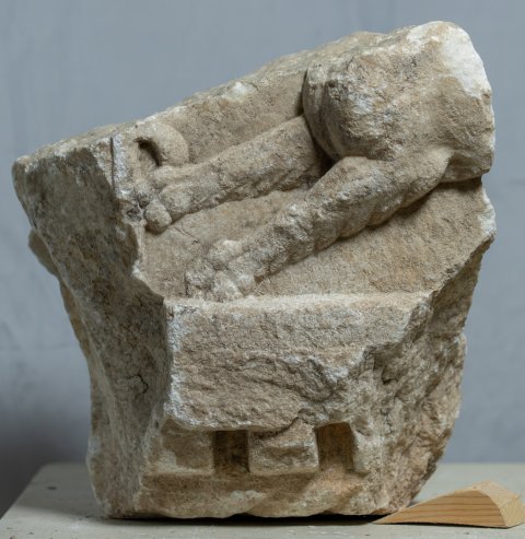 - Unten Rundstab, Zahnschnitt und Rahmenleiste. Darüber Frieszone mit Vorderbeinen und Teil des Rumpfes eines Raubtiers: Gefäß zwischen Panthern oder Greifen ?