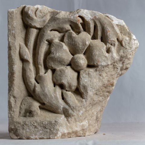 - Eckblock: auf einer Seite Akanthusranke mit Rosette, auf der links anstoßenden Seite Blattkelch.
