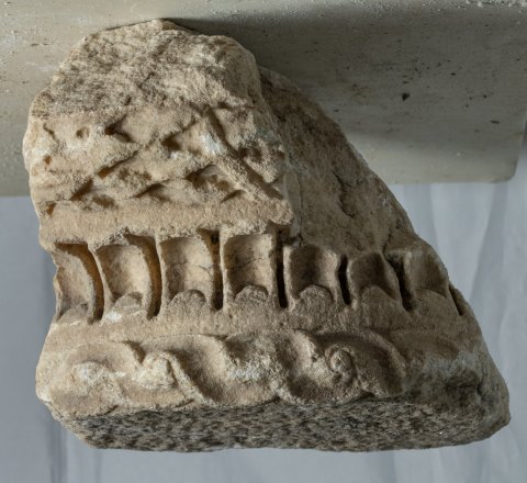 - Profiliertes Gesims mit Flechtband, Pfeifenstab und Rankenfries (?).