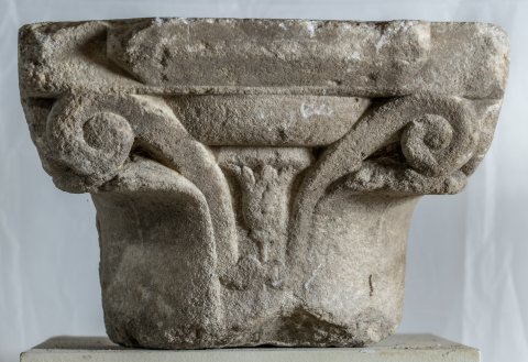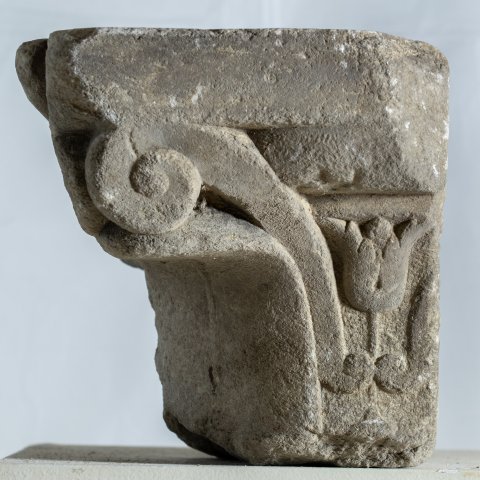 - Kapitell mit Blattkranz und Eckvoluten, dazwischen Blütenkelche.