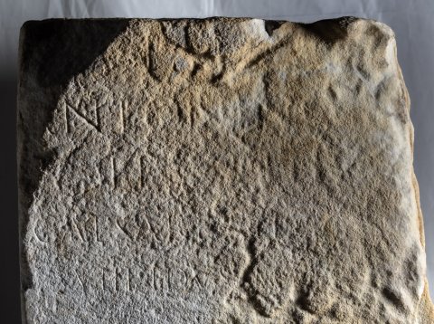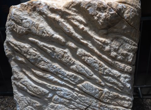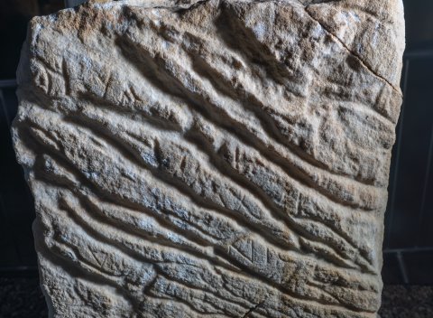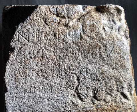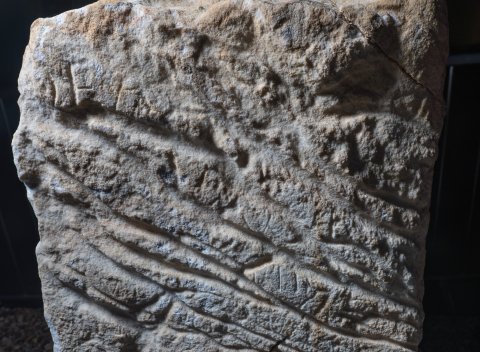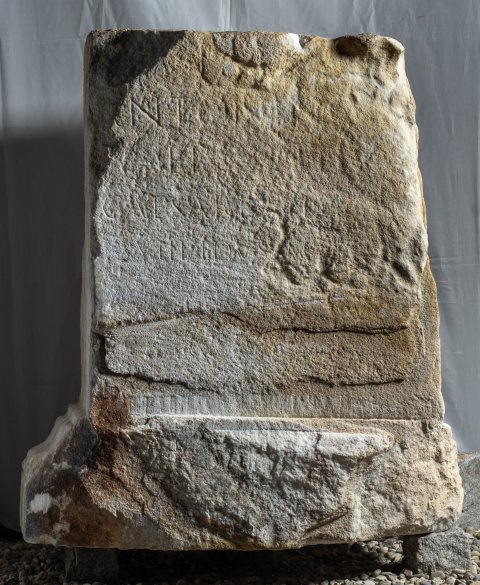 - oben abgeschnitten, Oberfläche stark abgerieben, eine Seite durch tiefe Rillen zerstört