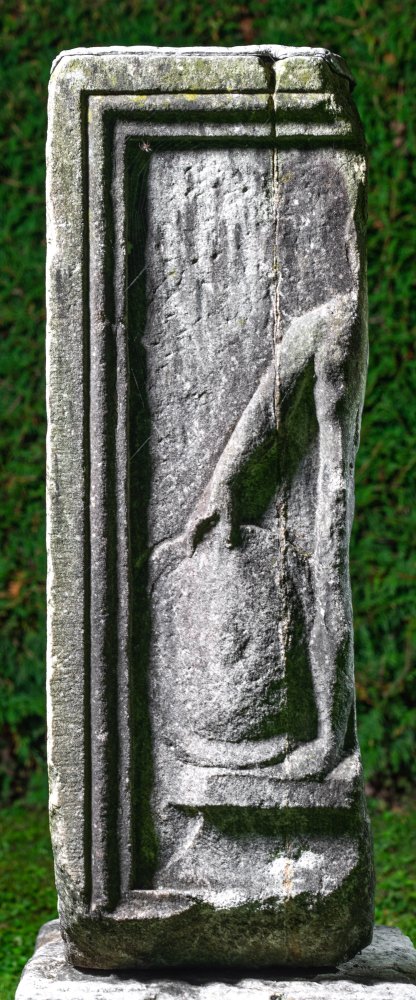 - Profiliert gerahmtes Bildfeld , darin auf Podest stehender Heros, die gesenkte Linke auf dem Rand eines Rundschildes. Teil der Sockelzone eines Grabbaus (in der Rekonstruktionszeichnung, siehe Nr. 31000, nicht berücksichtigt).