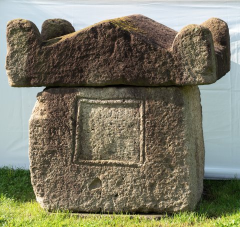 - Viereckige Kiste mit dachförmigem Deckel mit Eckakroteren.