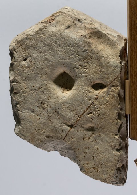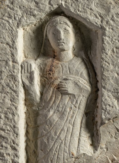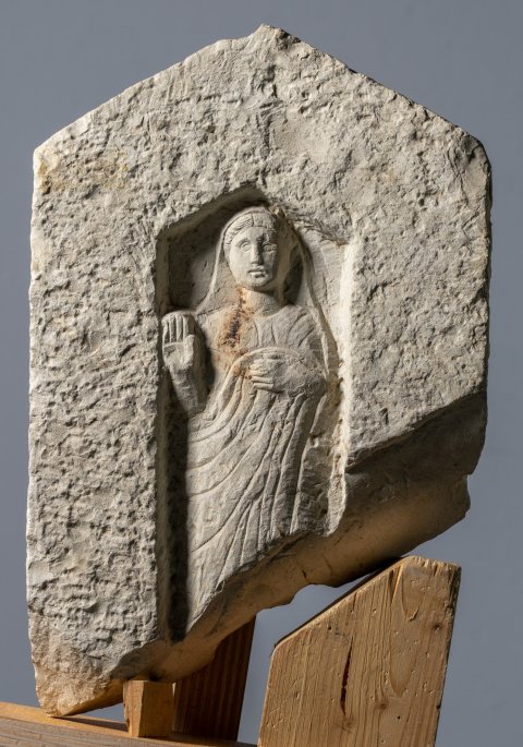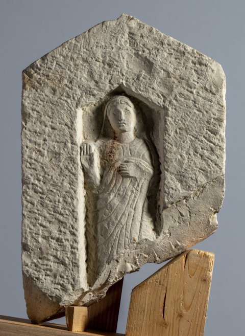 - Schmale Nische mit Giebel, darin stehende Frau in Tunica und über den Kopf gezogenem Mantel.