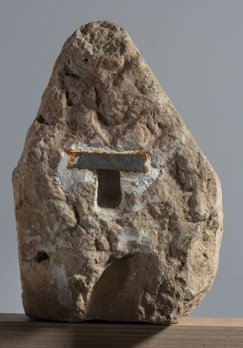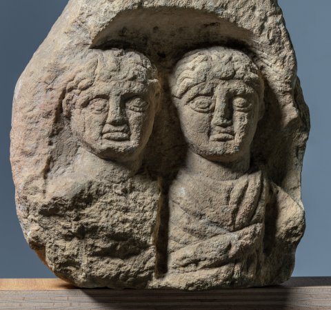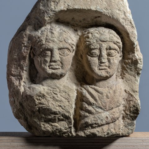 - Fragment einer Stele (?) mit Giebel, darunter Bogennische mit Brustbildern von zwei Frauen in Tunica und Mantel, die linke mit Halsband mit Anhänger, die rechte mit Scheitelschmuck.