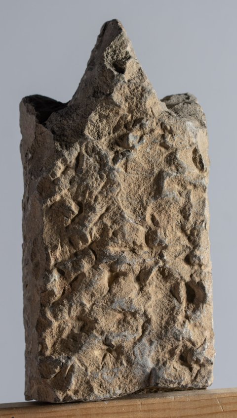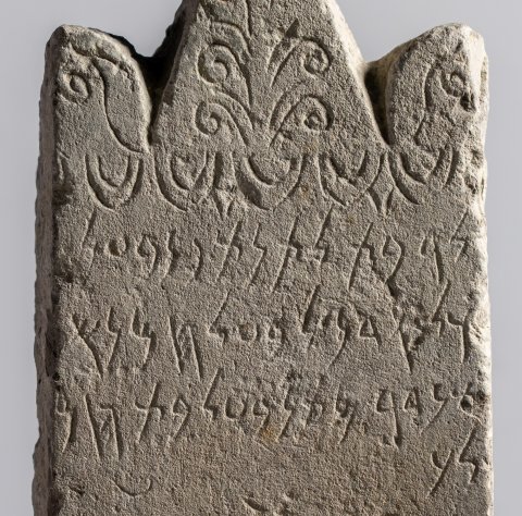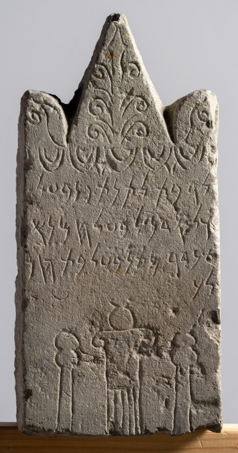 - Stele mit Giebel und Seitenakroteren und geritztem Dekor (oben Palmette, Eierstab, unter der Inschrift Säulen).