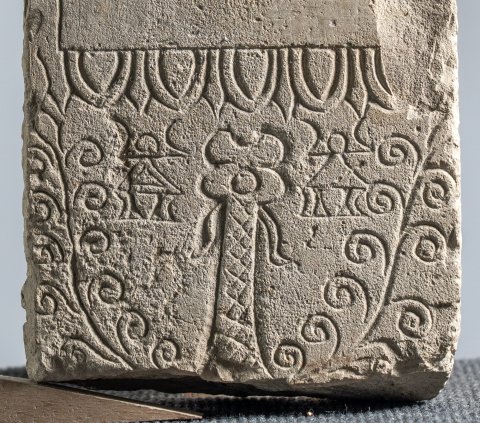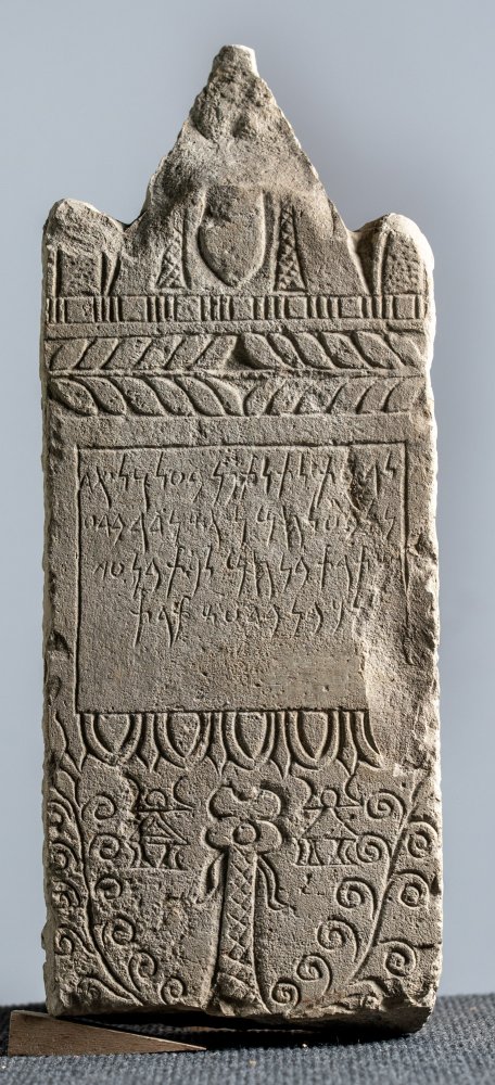 - Rahmenlose Stele mit Giebel und Seitenakroteren. Im Giebel Gefäß zwischen Bäumen (?), in den Akroteren Pinienzapfen (?). Darunter geritzter Metopenfries und Blattfries. Schriftfeld mit geritztem Rahmen, darunter Eierstab und Sockelbild mit Palme (?) zwischen Zweigen und kleinen stilisierten Figuren.