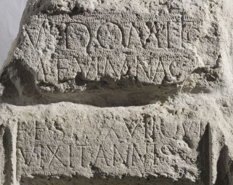- M(arco) Domitio / M(arci) f(ilio) Viminaci / [--- leg(ionis) IIII] / F(laviae) F(irmae) sti(pendiorum) XVII qui / vixit annis / [---]ndio / [---