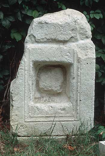 - Oberteil rundum verbr., auf der Inschriftseite ausgehöhlt, Sockel fehlt
