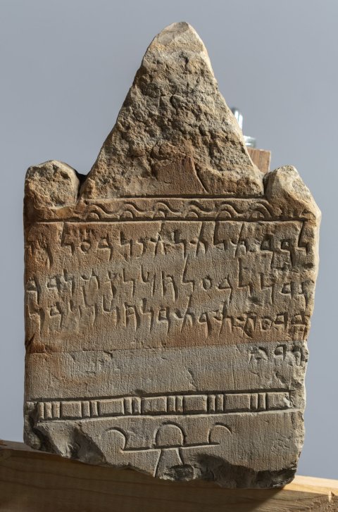 - Rahmenlose Stele mit Giebel und Seitenakroteren, im Giebel Ritzung. Inschrift zwischen horizontalen Leisten mit Wellenlinien und Metopen (Ritzung), unten Rest einer stilisierten Figur.