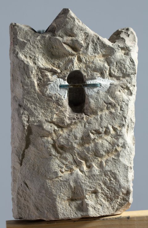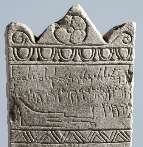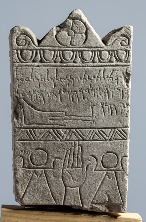 - Rahmenlose Stele mit Giebel und Seitenakroteren, im Giebel Rosette, in den Akroteren Spiralhaken. Inschrift zwischen horizontalen Leisten mit Eierstab und Zackenfries, innerhalb der letzten Zeile geritzter Schiffsbug (?). Sockelbild mit Hand zwischen stilisierten Figuren mit erhobenen Armen.