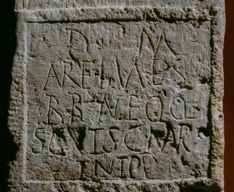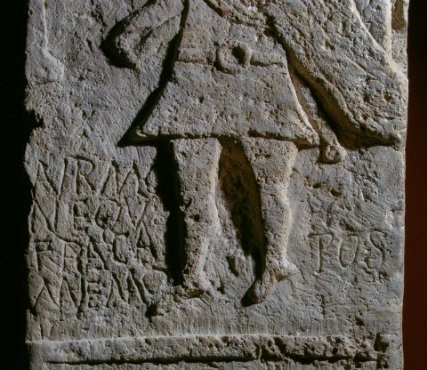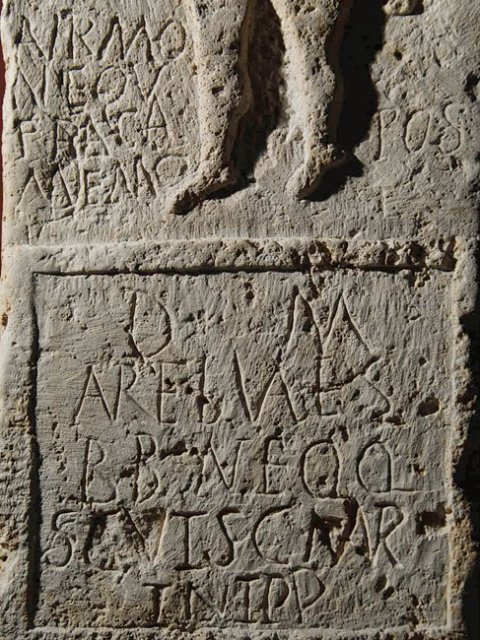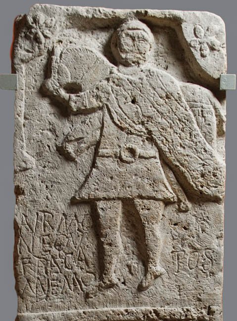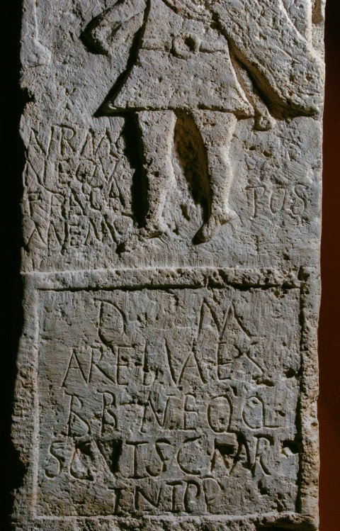 - Aur(elius) Mo/n(imus) equ(es) fra(tri) ca(rissimo) / memo(riam) pos(uit) // D(is) M(anibus) / Aur(elius) Vale(n)s / bb(---) n(umeri) eqq(uitum) / Scut(ariorum) s(ub) c(ura) Maur/ini p(rae)p(ositi)