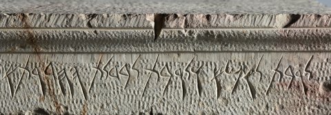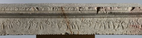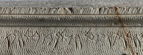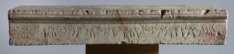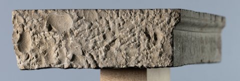 - auf einer Längsseite oben profiliertes Gesims, unterhalb davon Inschriftzeile