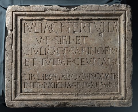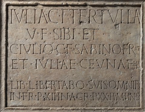 - Iulia C(ai) f(ilia) Tertulla / v(iva) f(ecit) sibi et / C(aio) Iulio C(ai) f(ilio) Sabino fratri / et Iuliae Ceunae matri / lib(ertis) libertab(us)q(ue) suis omnib(us) / in fr(onte) p(edes) XII in agr(o) p(edes) XX h(oc) m(onumentum) h(eredem) n(on) s(equetur)