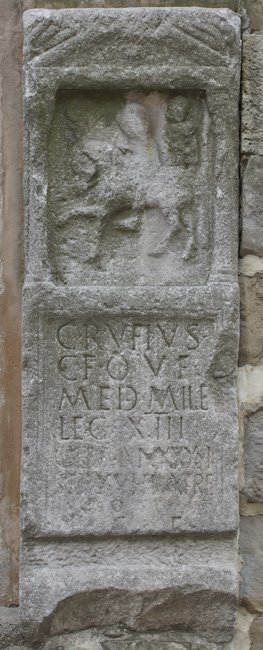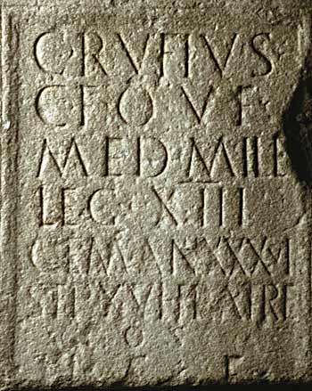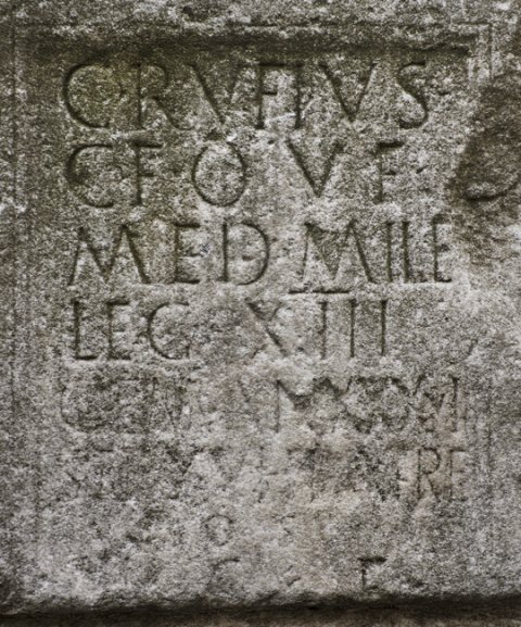 - C(aius) Rufius / C(ai) f(ilius) Ouf(entina) / Med(iolano) miles / leg(ionis) XIII / gem(inae) an(norum) XXXVI / st(i)p(endiorum) XVI fratre / (!) pos(uit) / h(ic) s(itus) e(st)